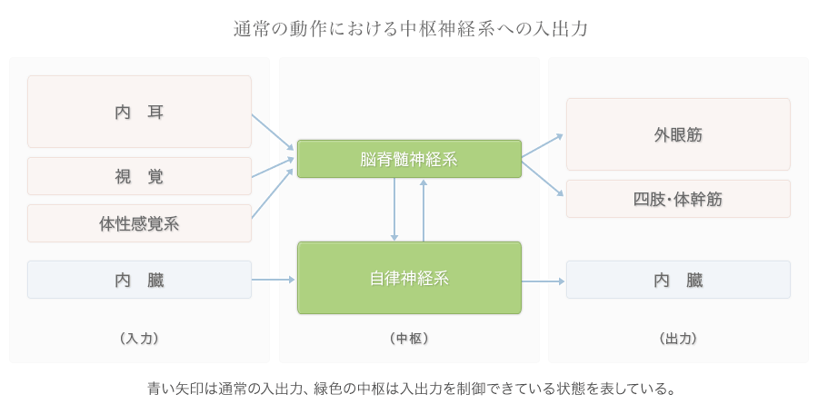 図1(クリックすると大きく表示します)問題点(1)、(2)、(3)を考慮して、通常の動作における中枢神経系への入出力を図1に示す。入力は内耳、視覚、体性感覚系、内臓(胃腸)、出力は外眼筋、四肢・体幹筋、内臓で、中枢は脳脊髄神経系と自律神経系に分けている。