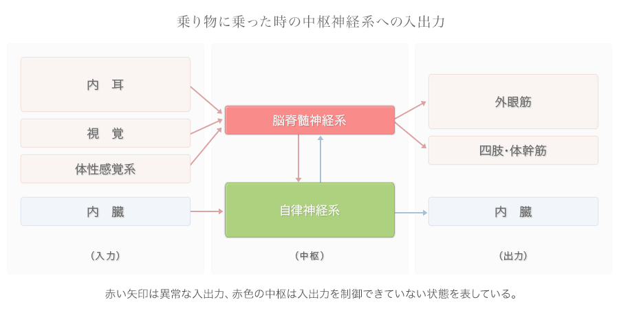 図2(クリックすると大きく表示します)乗り物が動き出した瞬間から内耳、視覚、体性感覚系、内臓(胃腸)から異常な入力(赤色の矢印)があり、脳脊髄神経系中枢は調節不能の状態で、赤くしている(図2)。外眼筋、四肢・体幹筋へは異常な出力があり、平衡機能障害を起こしている。小さい頃から乗り物に乗り慣れているせいで、目や体が揺れていること、つまり平衡機能障害を起こしていることを異常であるとは思わないのであろう。自律神経中枢が適切に調節しているために吐き気や嘔吐が現れず、自覚症状は何もない1),2)。