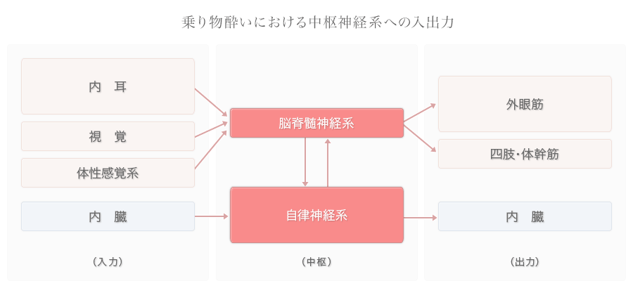 眼球の動きを制御できないのが、つまり平衡機能障害が乗り物酔いの主因であり、感覚混乱は平衡機能障害に伴う二次的な現象と考えられる。